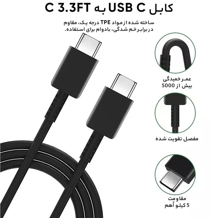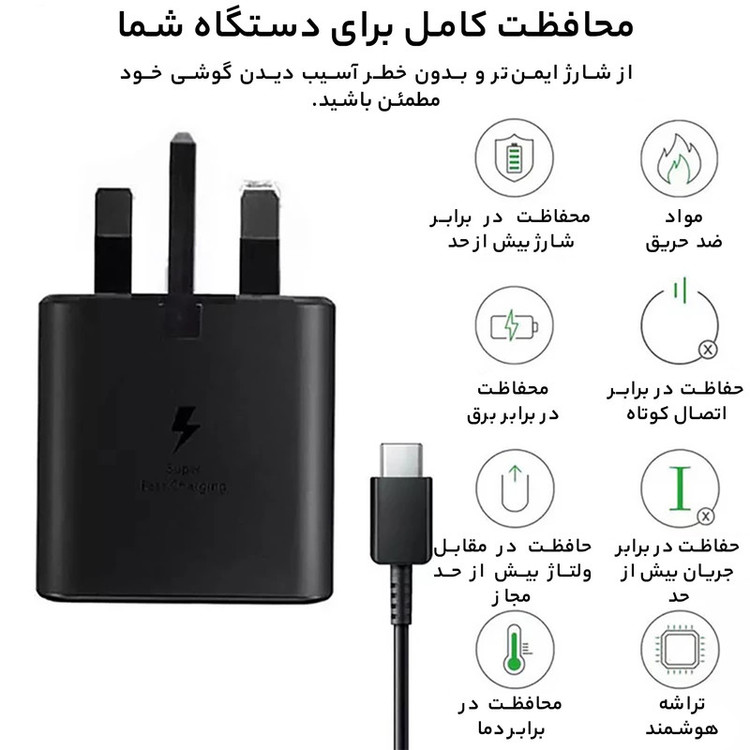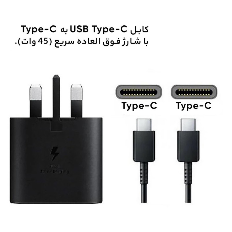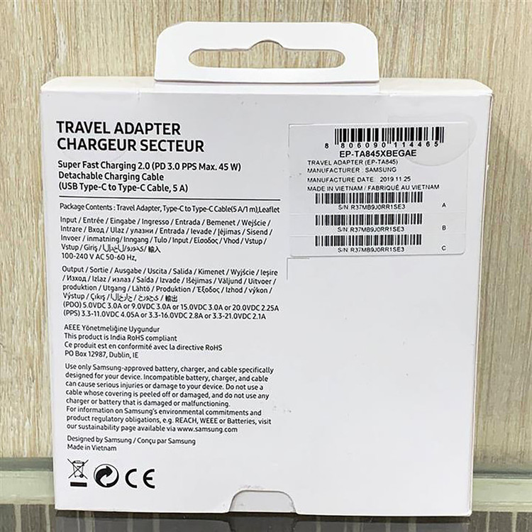 شارژر اصلی سامسونگ سوپر فست 45 وات مدل Travel Adapter Super Fast 45W Type-C (EP-TA845) شارژر 100 درصد اصلی و اورجینال سامسونگ میباشد. این محصول ساخت ویتنام میباشد. شارژر دیواری(EP-TA845) محصول شرکت سامسونگ است. این شارژر دیواری دارای فناوری PD 3.0 است که با استفاده از آن می توانید دستگاه خود را با سرعت بیشتر و با توان 45 وات شارژ کنید. شدت جریان خروجی این شارژر برابر با 5 آمپر است که می توان از آن برای شارژ کردن تبلت هم استفاده کنید. برای این شارژر از چیپ هوشمندی استفاده شده تا با اتصال دستگاه به صورت خودکار جریان مناسب را برای دستگاه تامین کند. درگاه خروجی این محصول هم از نوع USB-C است. البته همراه با این شارژر یک کابل تبدیل USB-C به USB-C به طول یک متر هم ارائه میشود. این شارژر سایر محصولات و موبایل های سری 2019 به بالا و گوشی هایی که توانایی شارژ سوپرفست را دارند پشتیبانی می کند.