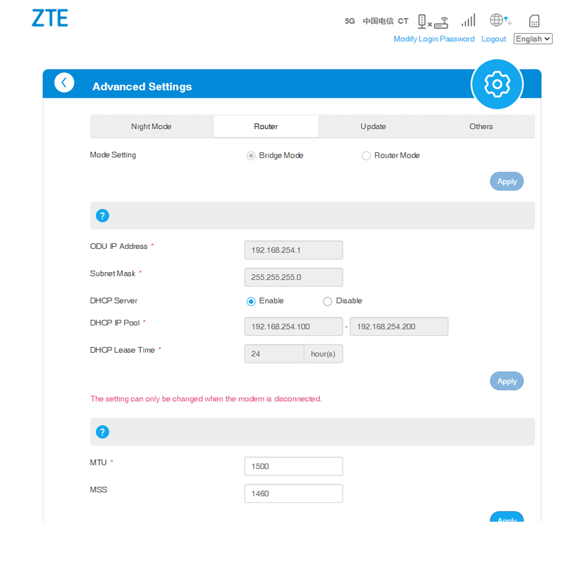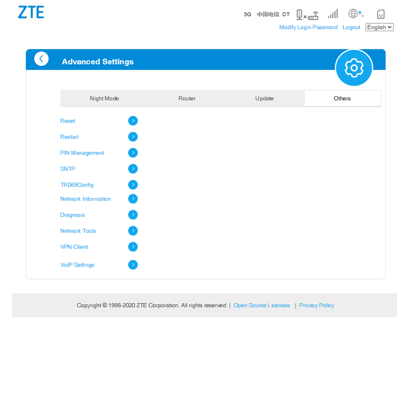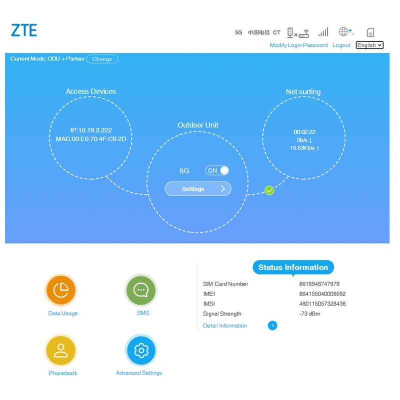 در پنل مدیریتی این مودم میتوانید ابزارهایی مانند فایروال، کنترل والدین، بهروزرسانی خودکار فریمویر، فیلترسازی آدرسهای IP و MAC، ارسال و دریافت پیامک (SMS)، مدیریت مخاطبان، مدیریت مصرف کاربران، وی پی ان کلاینت VPN ، تنظیمات VoIP، ابزار عیبیابی سیگنالهای ۵G